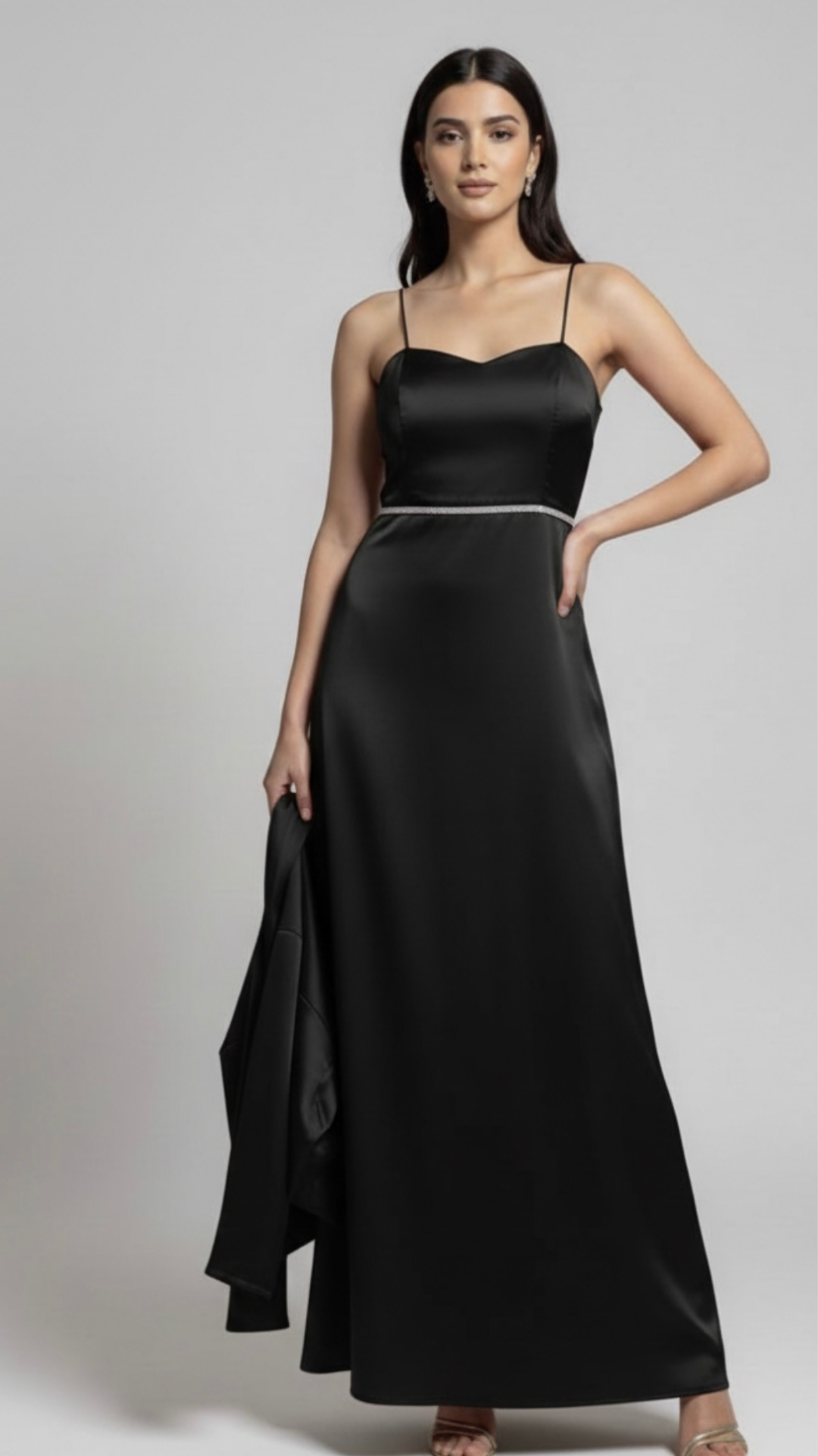 Step into timeless elegance with this stunning black satin maxi dress paired with a stylish matching jacket. Designed to give a sleek and graceful silhouette, this outfit is perfect for evening parties, formal events, and special occasions. The smooth satin finish adds a luxurious shine, while the fitted bodice and flowy flare enhance your overall look. The attached belt detail defines the waistline beautifully, and the lightweight jacket adds sophistication and comfort.