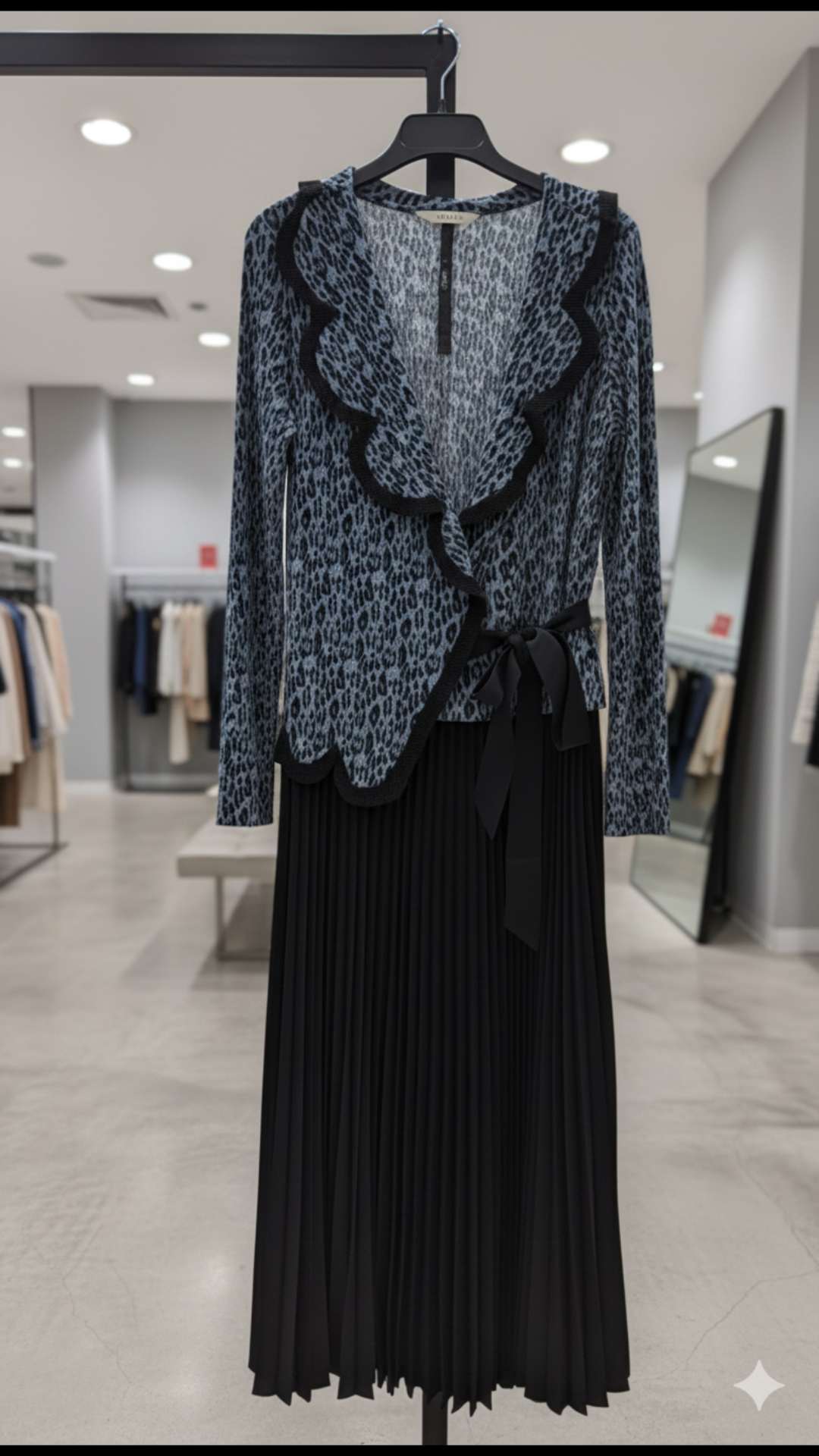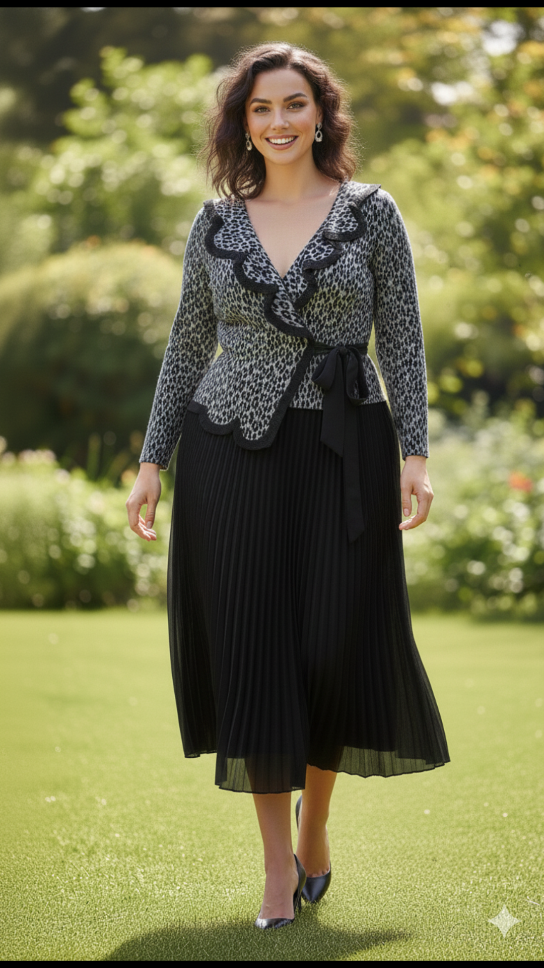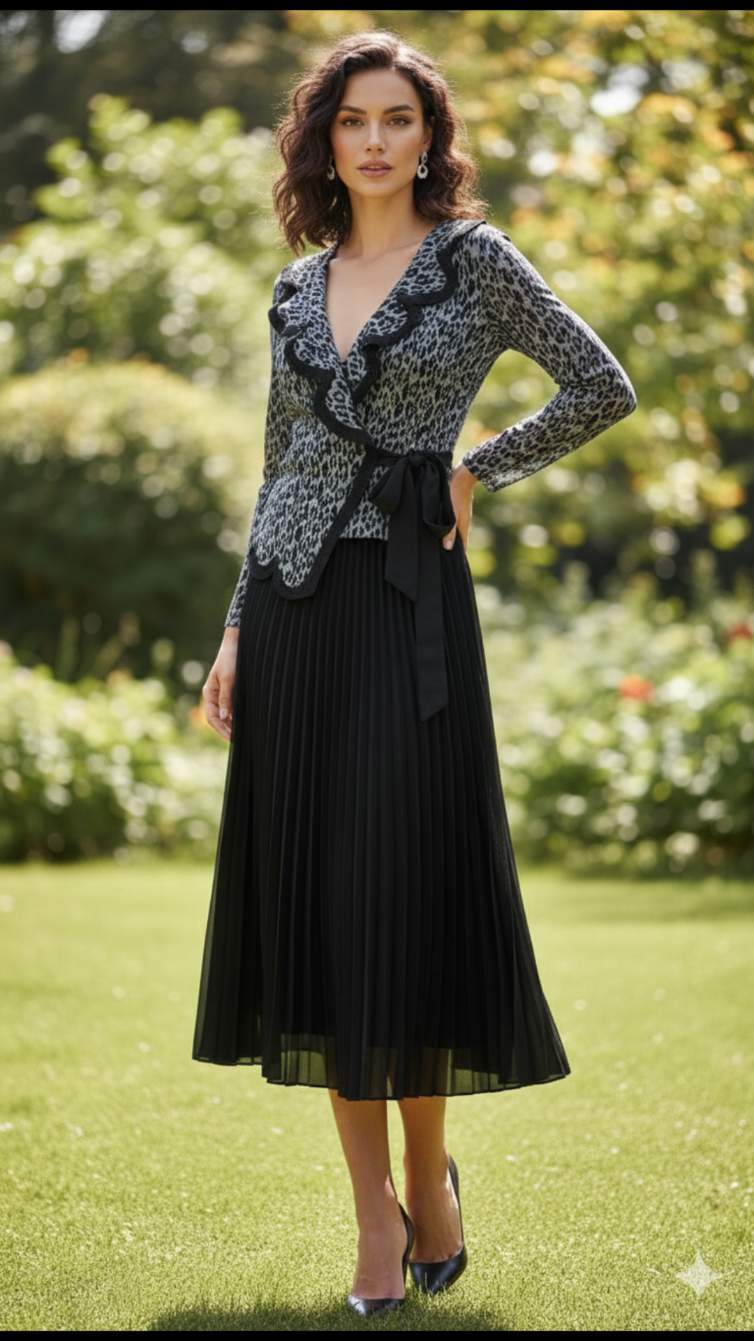 Designed to flatter every body type, this magic-fit dress effortlessly adapts from S to 5XL, offering a perfect blend of elegance and comfort. Featuring a chic leopard-print wrap-style top with soft ruffle detailing and a graceful black pleated maxi skirt, this dress creates a slimming, flowy silhouette for all sizes. The adjustable waist tie enhances the fit, making it ideal for parties, dinners, festive gatherings, or elegant day outings.
